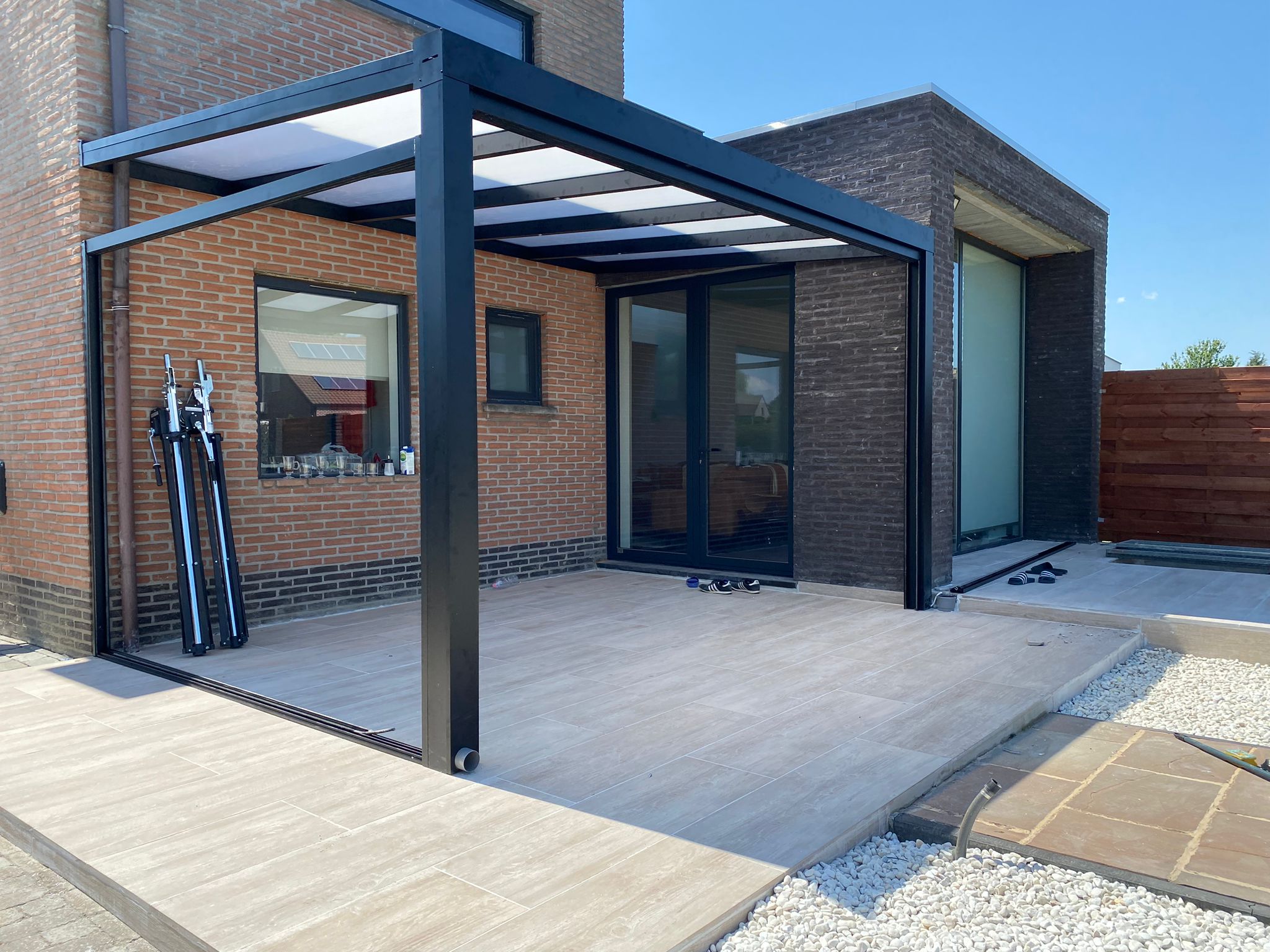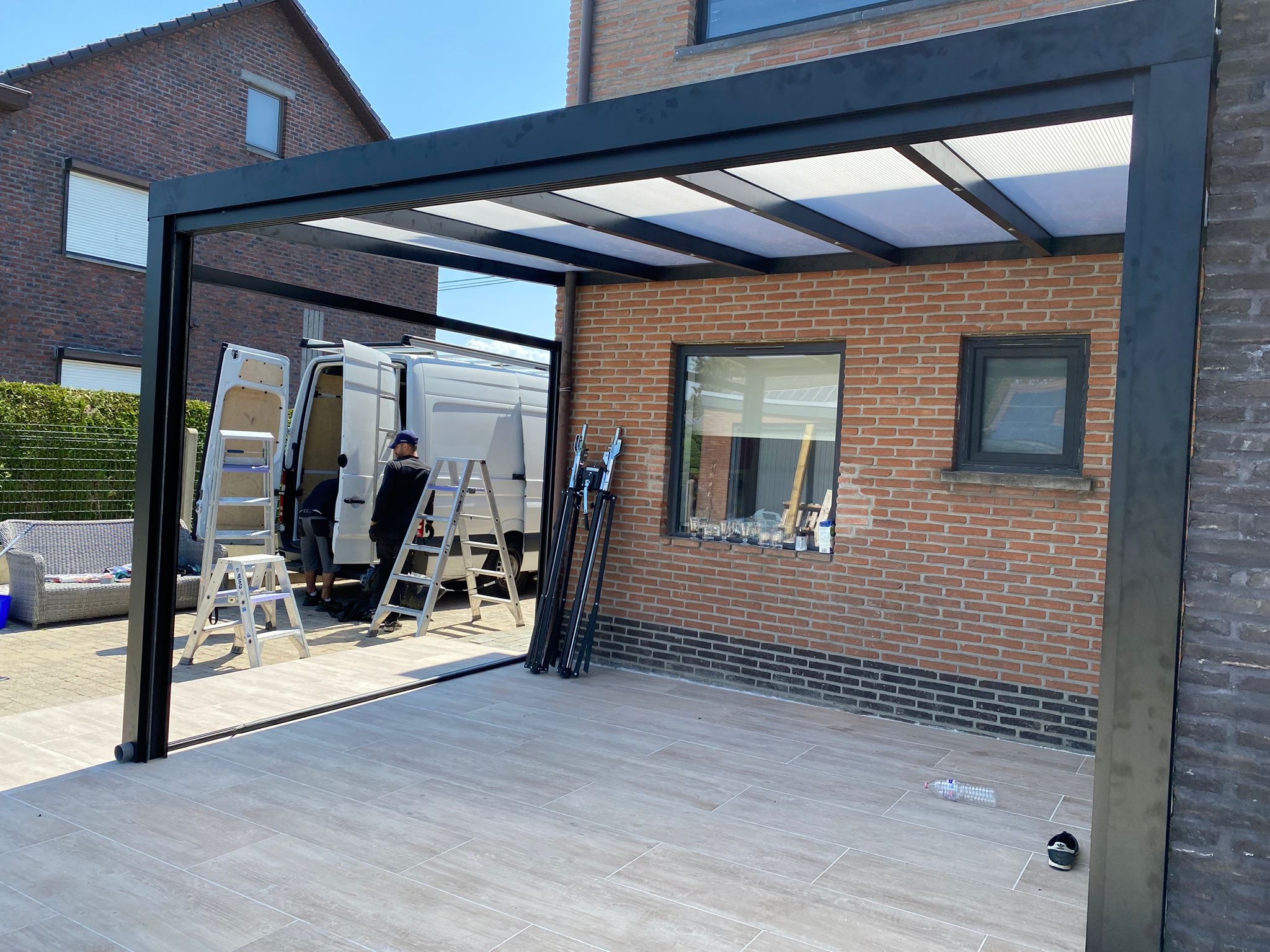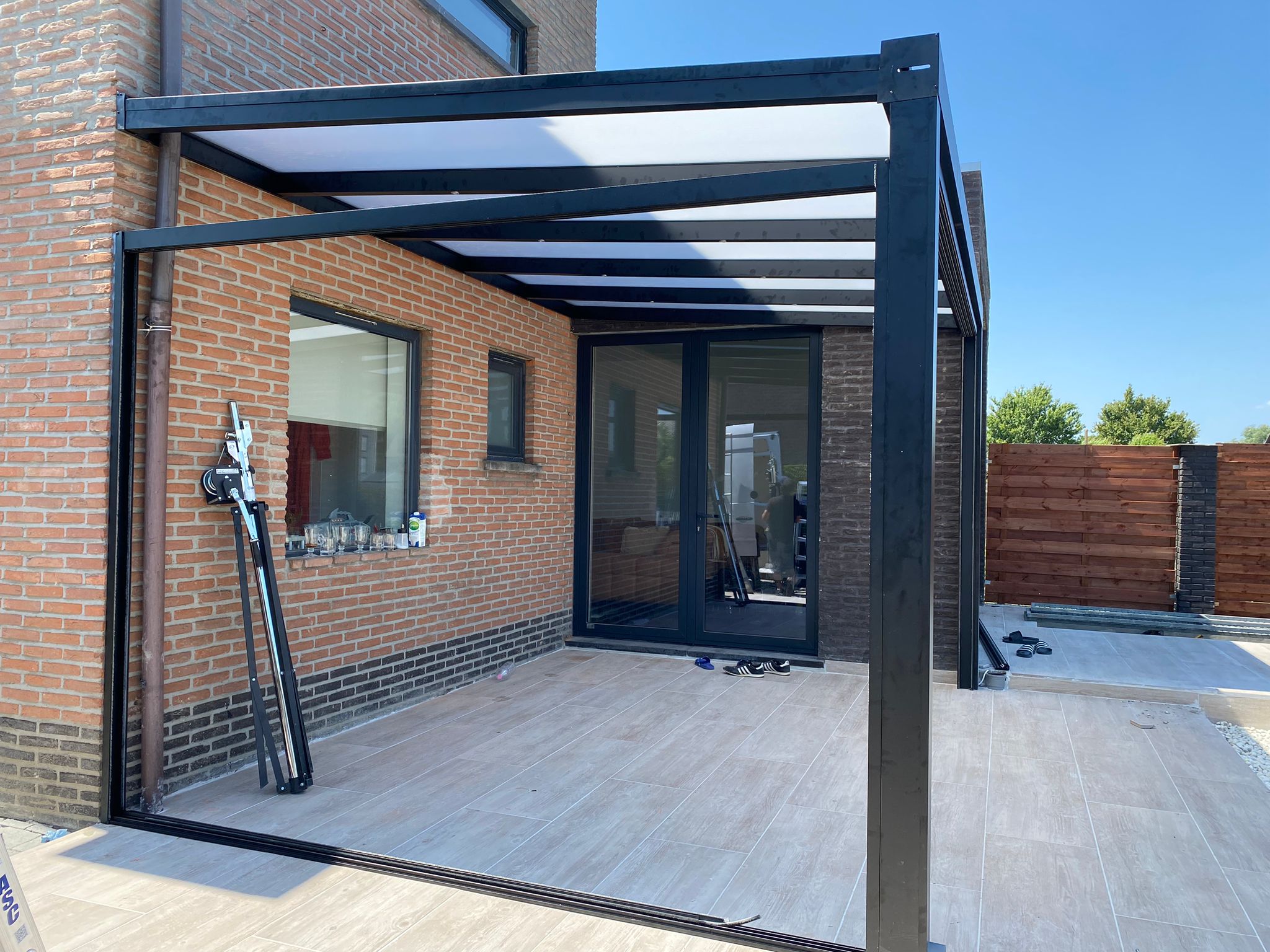 Na zorgvuldige metingen en voorbereidingen, waarbij elke dimensie en hoek werd geanalyseerd, begonnen we aan de uitvoering van het project. Het terrein bood al een solide basis met een bestaand terras van tegels op beton, waardoor we de staanders niet hoefden in te graven. Met precisie en vakmanschap monteerden we ze op de stevige ondergrond, een testament aan onze toewijding aan zowel esthetiek als duurzaamheid.